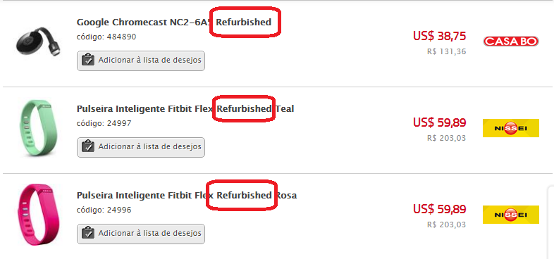 Outras lojas grandes optam por não vender nenhum produto recondicionado na loja, mas quando possuem algum, deixam claro que o produto já sofreu algum reparo ou foi devolvido por algum motivo.