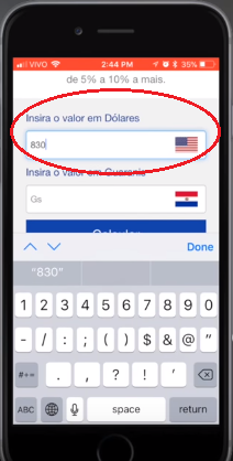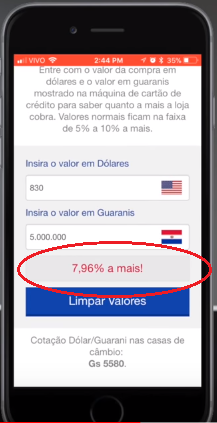 Dentro do aplicativo do Compras Paraguai (somente no app) está disponibilizado uma calculadora que te mostra quanto a mais você está pagando em guarani em relação ao dólar.